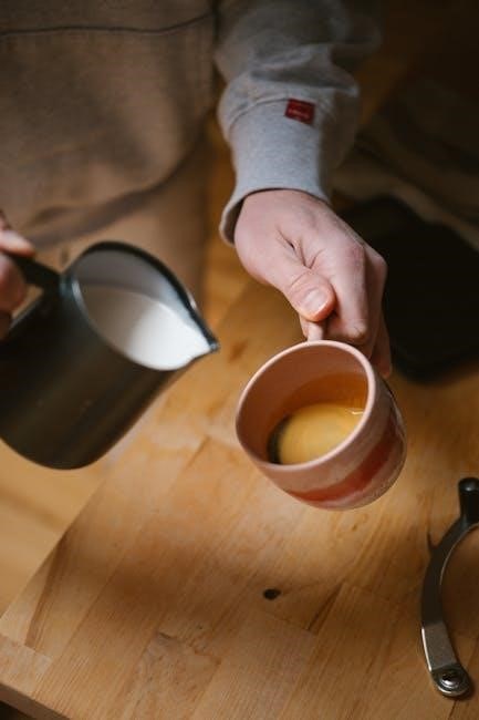 Listen for a gentle hissing sound – this indicates proper aeration. Once the milk volume increases, lower the jug to heat the milk without adding more air. If the milk isn’t frothing, check the steam pressure and wand position. For larger quantities, use a larger milk jug. Clean the steam wand immediately after each use to prevent milk buildup, as detailed in the manual’s care and cleaning section.